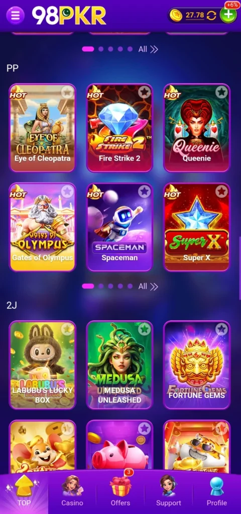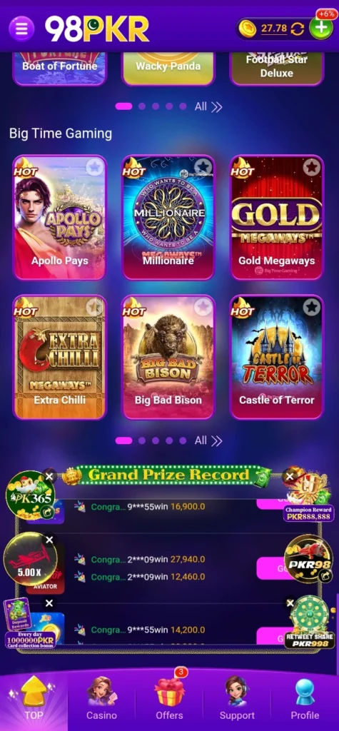 Casino slot games are one of the most popular options on 98PKR. These games are simple to play and don’t require any special skills. You just spin and try your luck to win rewards and bonuses.